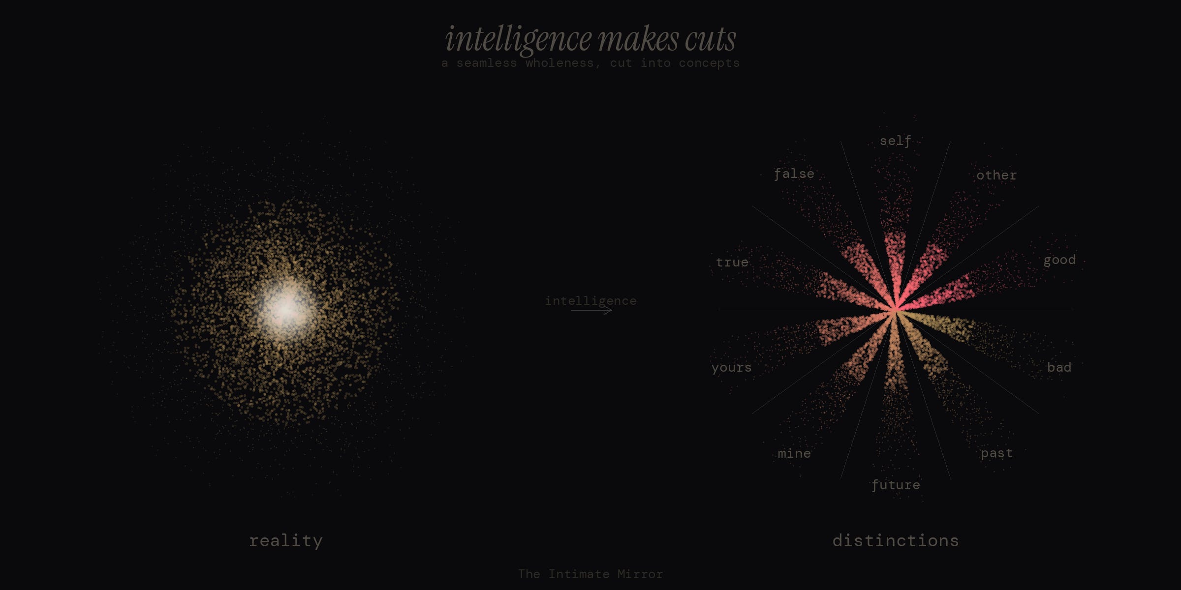 Intelligence makes cuts. That is what it does. Reality is a seamless, open wholeness — constantly unfolding, constantly becoming, non-separate in all ways. Intelligence takes that seamless fabric and cuts it. It makes distinctions. It draws boundaries where no boundaries exist.